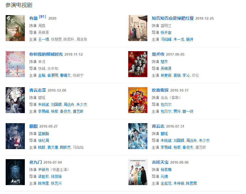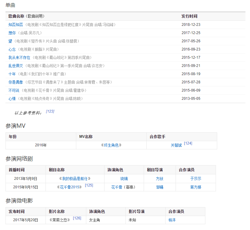 2015年,主演的仙俠劇《花千骨》打破中國內地周播劇收視紀錄 ,而其個人則憑借該劇先后獲得第6屆澳門國際電視節(jié)金蓮花最佳女主角獎、第6屆國劇盛典最具收視號召力演員獎、第22屆上海電視節(jié)白玉蘭獎最佳女主角獎提名、第28屆中國電視金鷹獎觀眾喜愛的女演員獎。2017年,憑借電影《乘風破浪》獲得第24屆北京大學生電影節(jié)最受大學生歡迎女演員獎;同年主演的古裝劇《楚喬傳》成為中國內地首部在播期間網絡播放量突破400億次的電視劇 。2018年,主演的都市劇《你和我的傾城時光》播出。2019年5月,憑借古裝劇《知否知否應是綠肥紅瘦》獲得第25屆上海電視節(jié)白玉蘭獎最佳女演員提名。2020年,主演古裝武俠劇《有翡》。