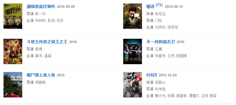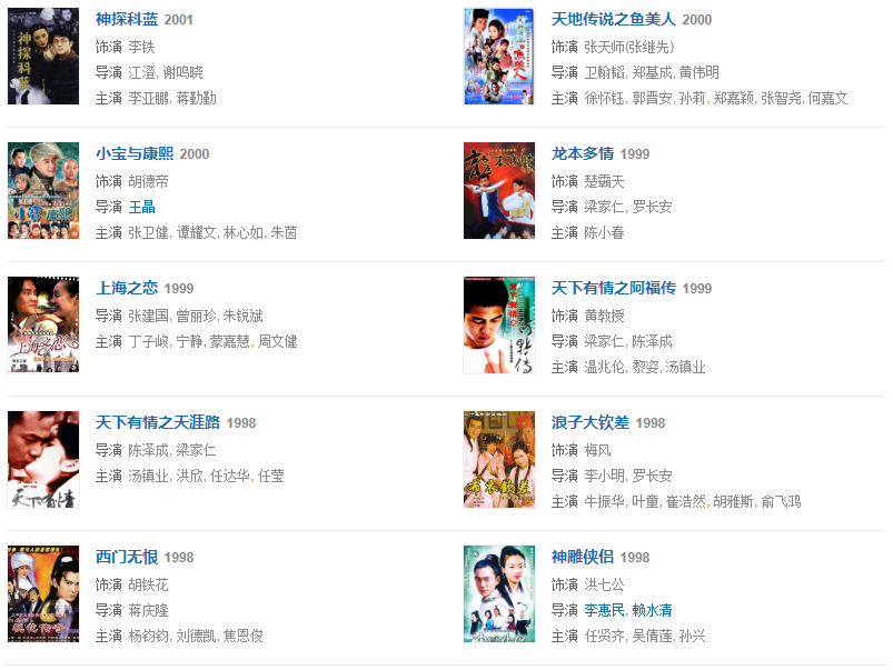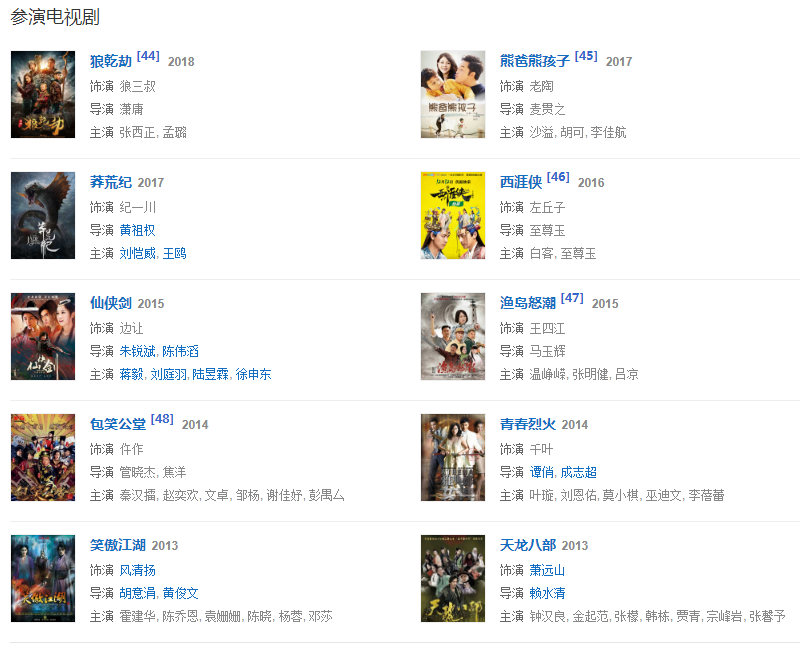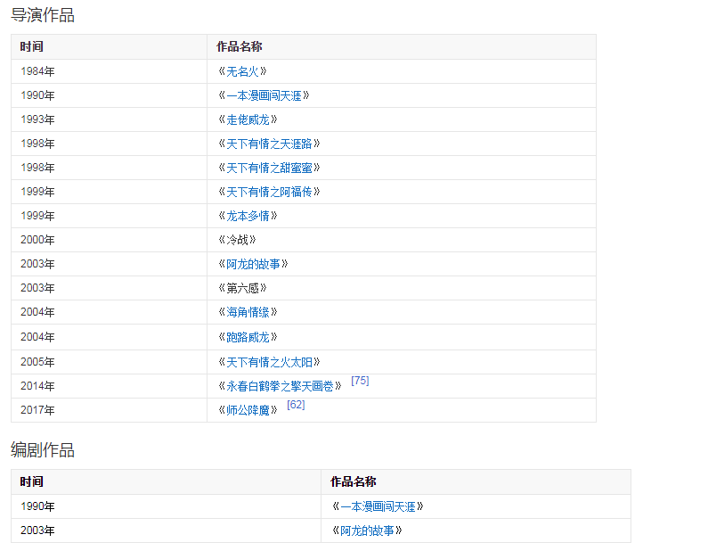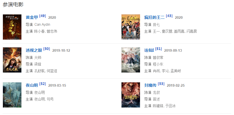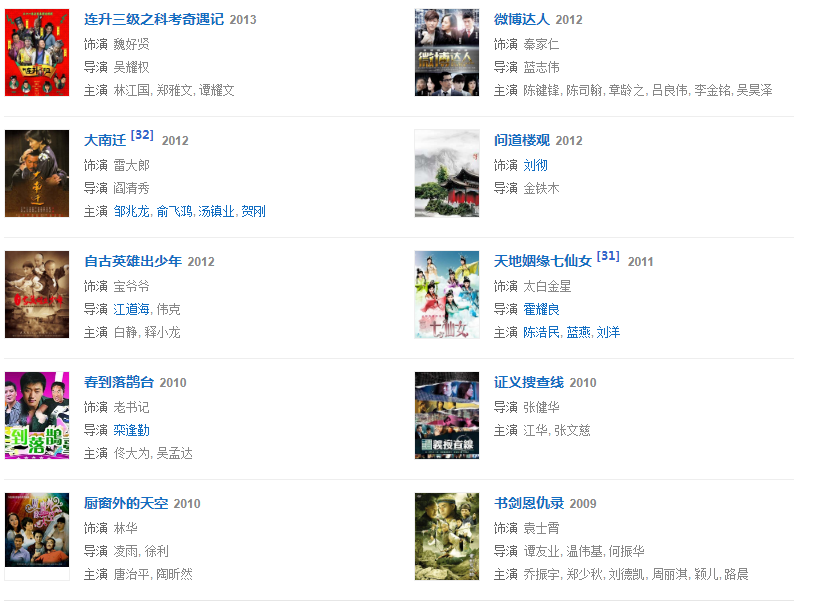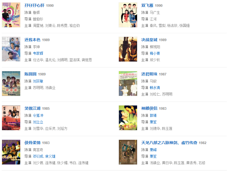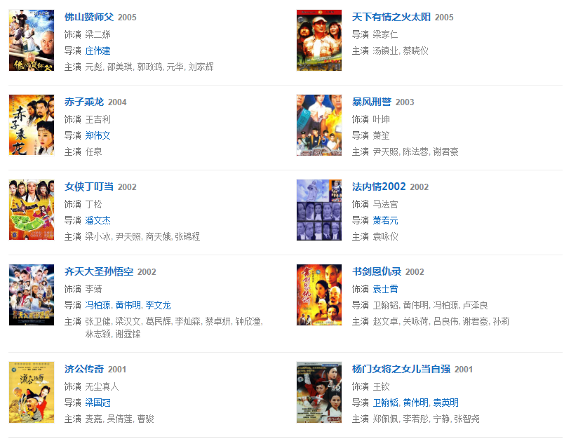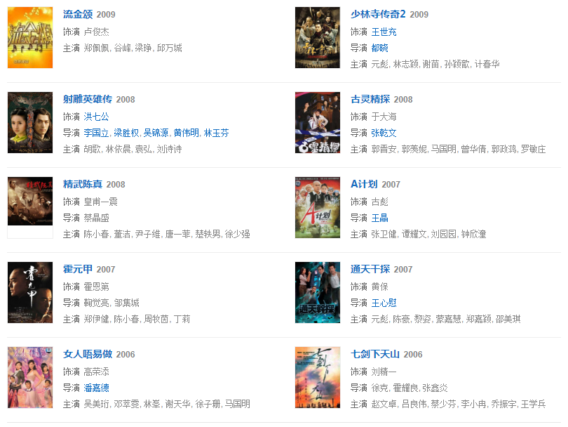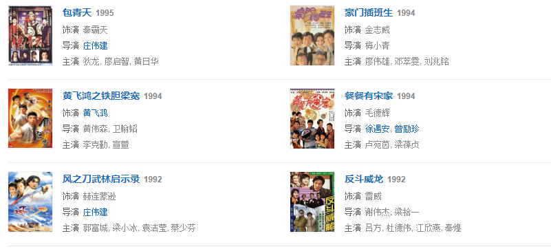 1976年,參與動作電影《蔡李佛小子》。1977年,主演了陳觀泰自導自演的電影《少年黃飛鴻之鐵猴子》。1979年,主演動作警匪電影《睡拳怪招》。1982年,主演動作奇幻喜劇電影《奇門遁甲》。同年主演武俠劇《天龍八部》,飾演蕭峰。1984年,主演冒險動作片電影《無名火》。同年參演武俠劇《神雕俠侶》,飾演郭靖。1986年,主演了袁和平執(zhí)導的僵尸電影《僵尸怕怕》。1989年,主演電影《火爆行動》。1990年,主演動作喜劇電影《一本漫畫闖天涯》。1993年,主演古龍小說改編的電影《西門無恨》。1995年,主演喜劇電影《回魂夜》。1998年,主演電影《殺手天使》。1999年,主演電影《奪命九千歲》。2003年,主演了抗“非典”溫馨勵志電影《阿龍的故事》。2005年,主演古裝武打神話動作片《天音琴魔》。2007年,主演賀歲商業(yè)電影《大灌籃》。2008年,參演武俠劇《射雕英雄傳》,飾演洪七公。2009年,出演了古裝喜劇《大內密探靈靈狗》。2011年,主演了根據民間故事改編的電影《忠烈楊家將》。2013年,主演了電影《刺客》。2015年6月19日在海南電影節(jié)上獲得終身成就獎。