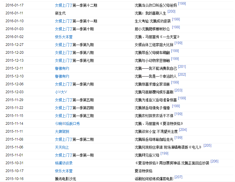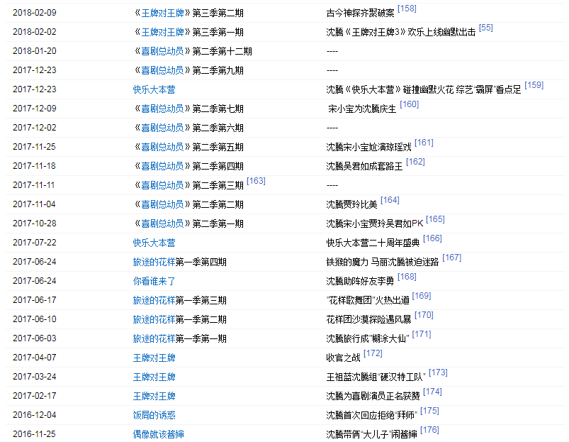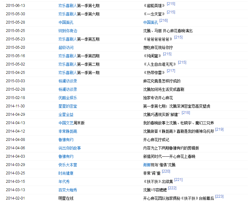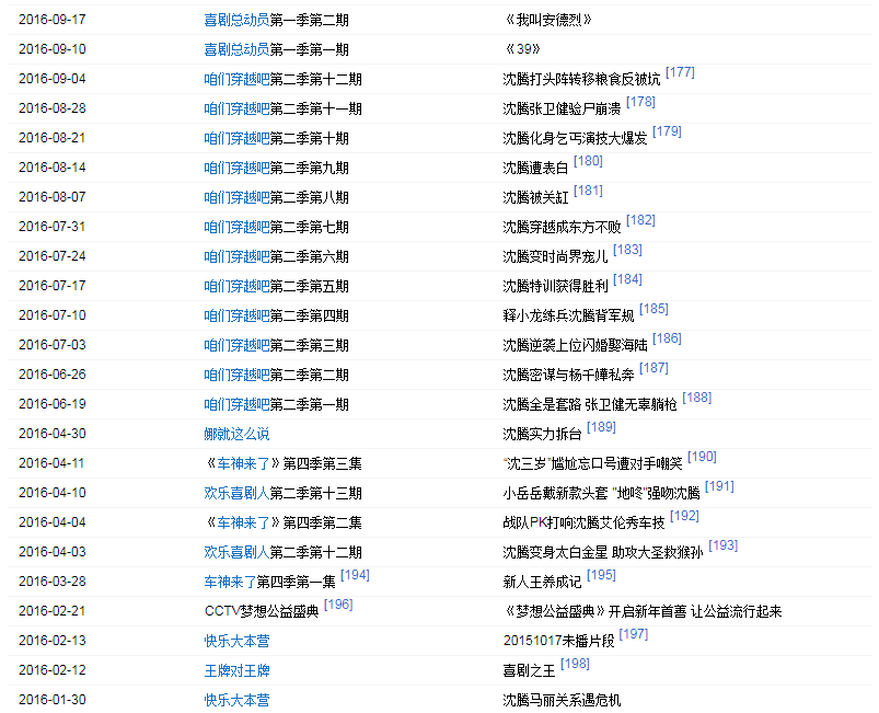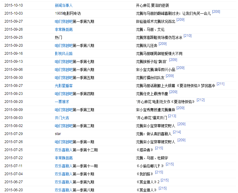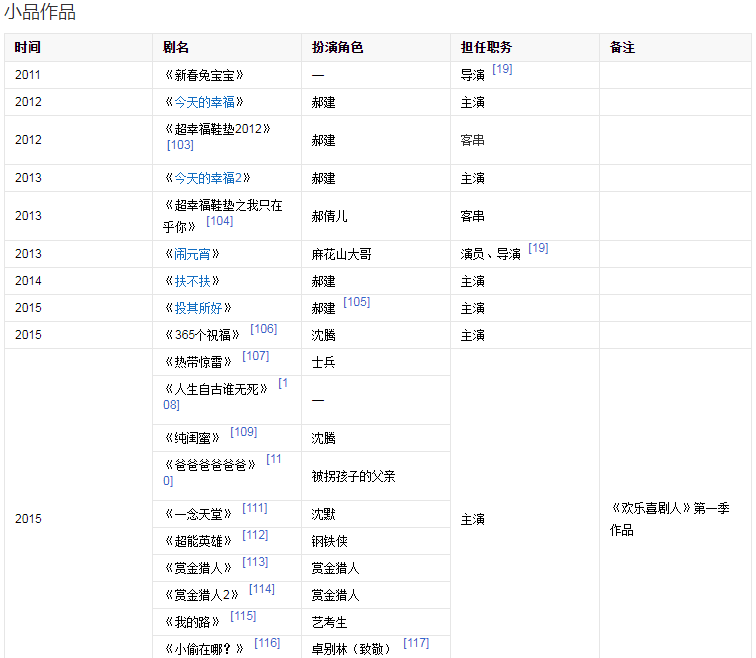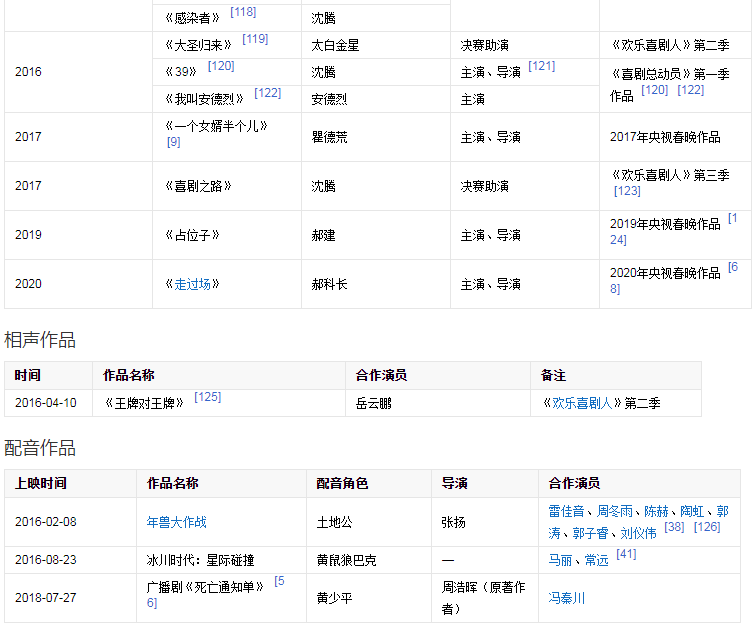 2003年出演開心麻花第一部舞臺劇《想吃麻花現(xiàn)給你擰》。2006年出演話劇《我在天堂等你》。2012年首次登上央視春晚,并在春晚上表演小品《今天的幸福》,憑借小品中飾演的“郝建”獲得廣泛關(guān)注。2013年再次登上央視春晚,并表演小品《今天的幸福2》;同年4月25日獲得第四屆現(xiàn)代戲劇谷2013壹戲劇大賞“年度新銳男演員”獎(jiǎng)。2014年第三次登上央視春晚,表演小品《扶不扶》。同年4月參與電視劇《你是我的眼》的拍攝,在劇中飾演男主角張三斤。2015年第四次登上央視春晚表演小品《投其所好》。2015年參加《歡樂喜劇人》第一季,并獲得冠軍。2015年9月30日,沈騰與馬麗領(lǐng)銜主演的喜劇電影《夏洛特?zé)?/a>》上映。2016年特別出演電影《王牌逗王牌》。2017年在央視春晚上表演小品《一個(gè)女婿半個(gè)兒》;同年參演開心麻花第三部電影《羞羞的鐵拳》。